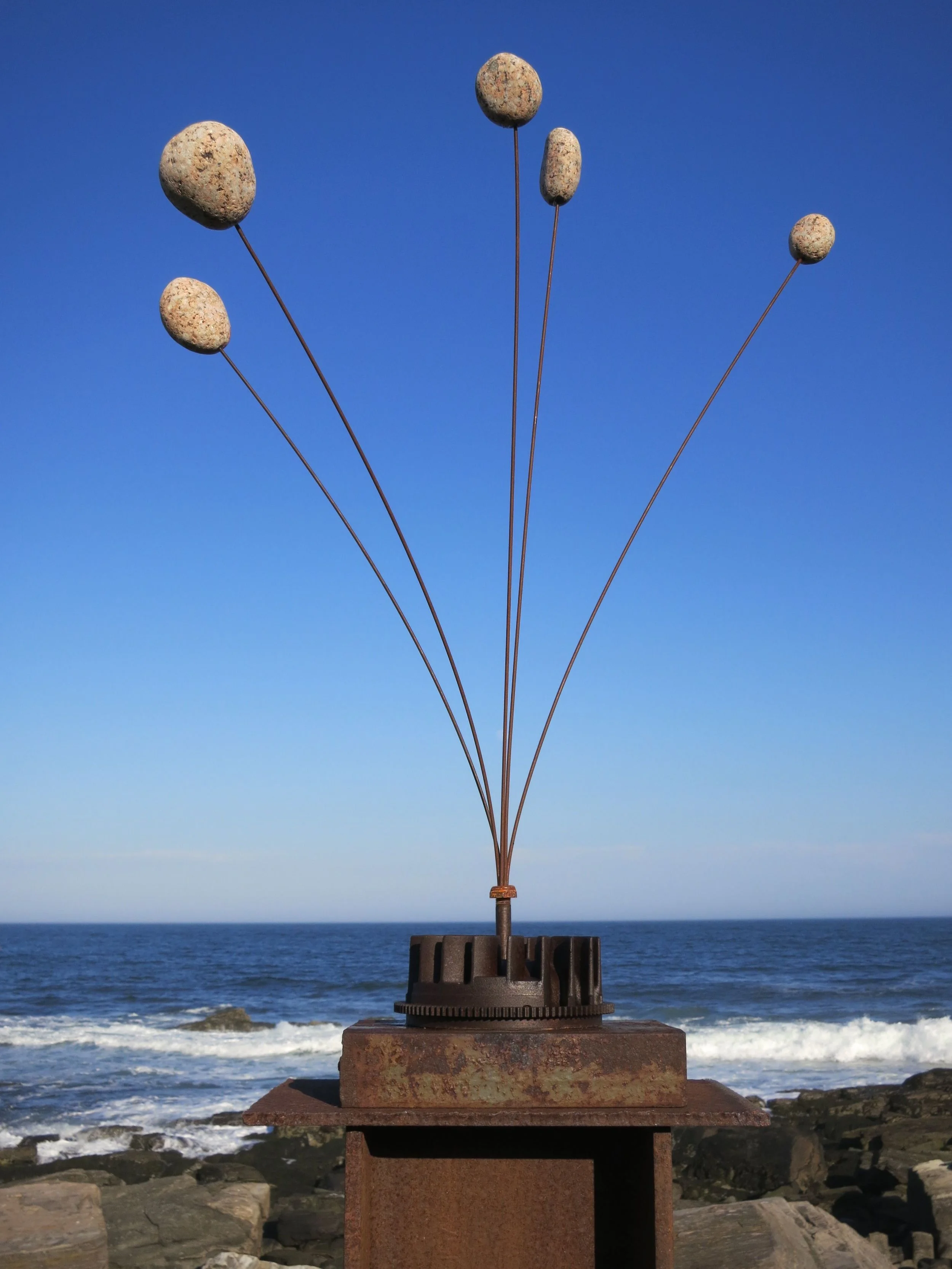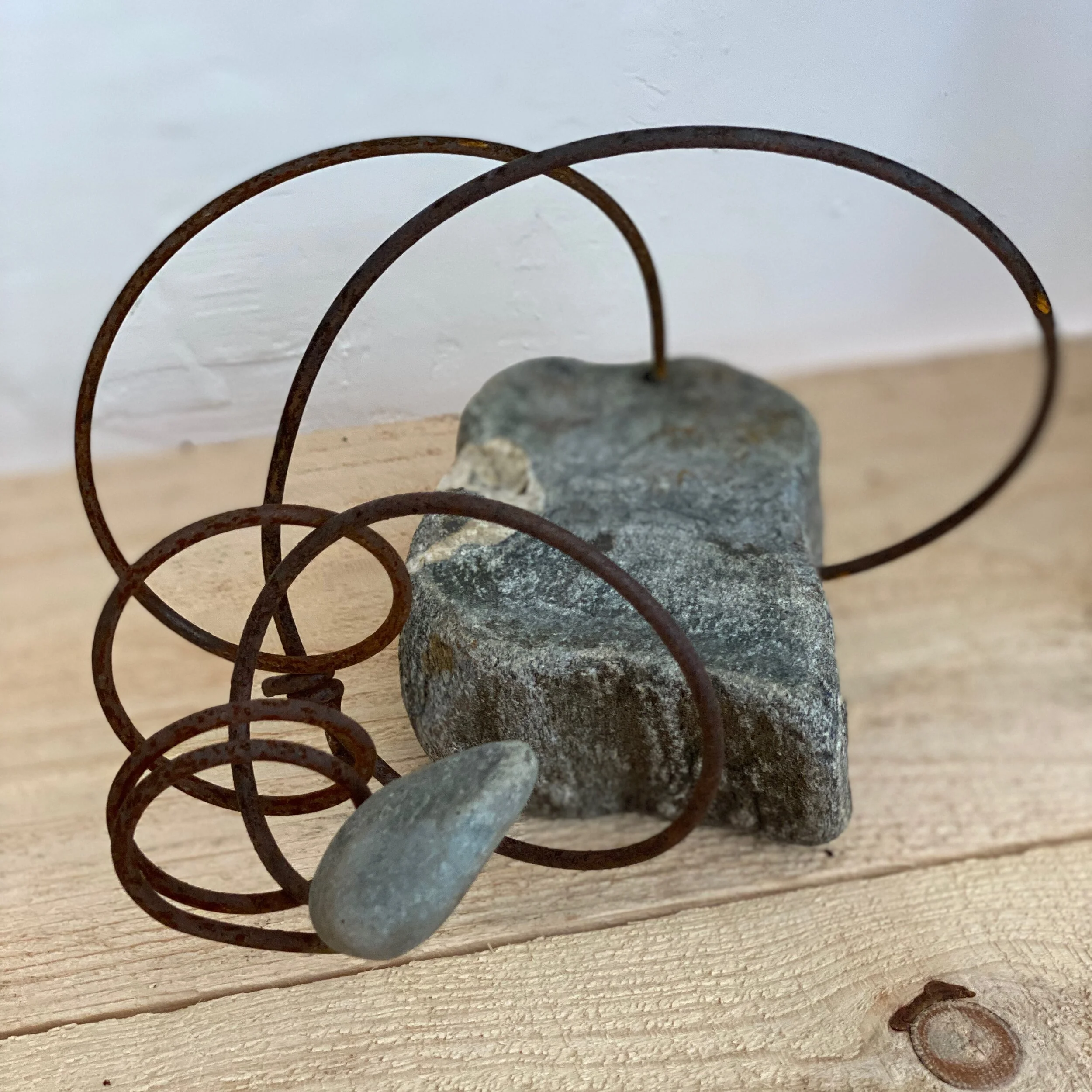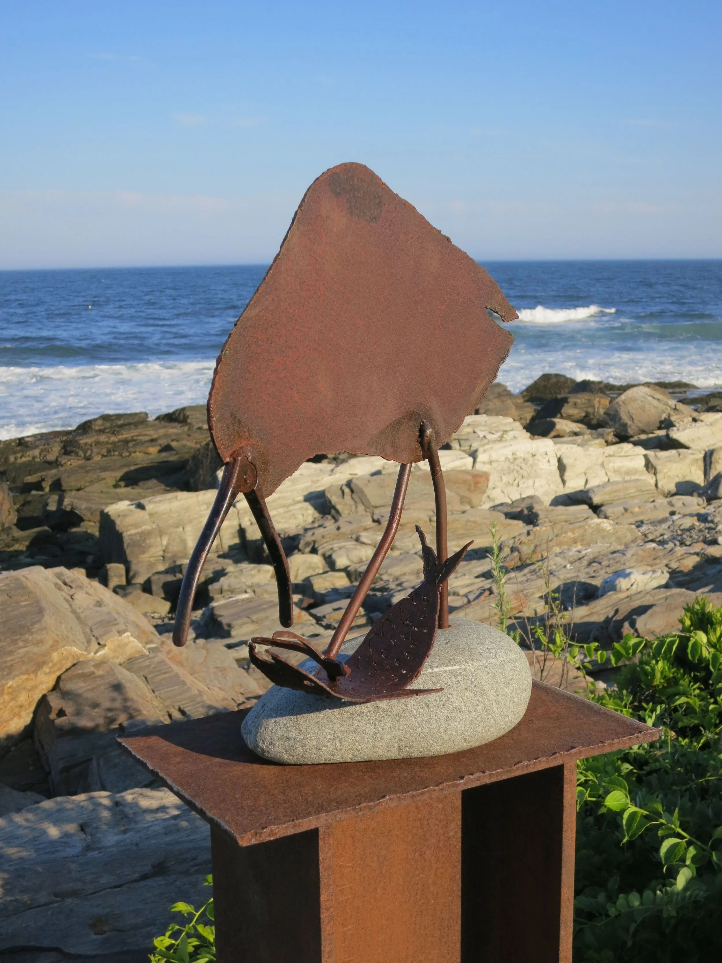 I’m intrigued by birds, and see them daily where I live near the ocean. The first birds I made were needle felted and from tin cans. The steel birds are the beginning of a series I hope to make of different birds I’ve seen or see on a regular basis. Birds' homes are another fascination to me.  I’ve used stone and granite with some of my work. The steel and stone sculptures play with the ideas of whimsy and solidity, motion and stillness. Recently I’ve also incorporated wax and wool felting into the work with steel to play with textures.